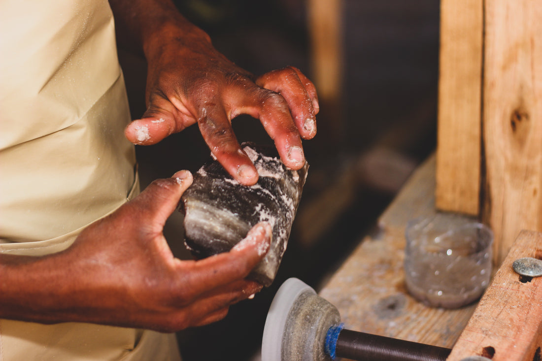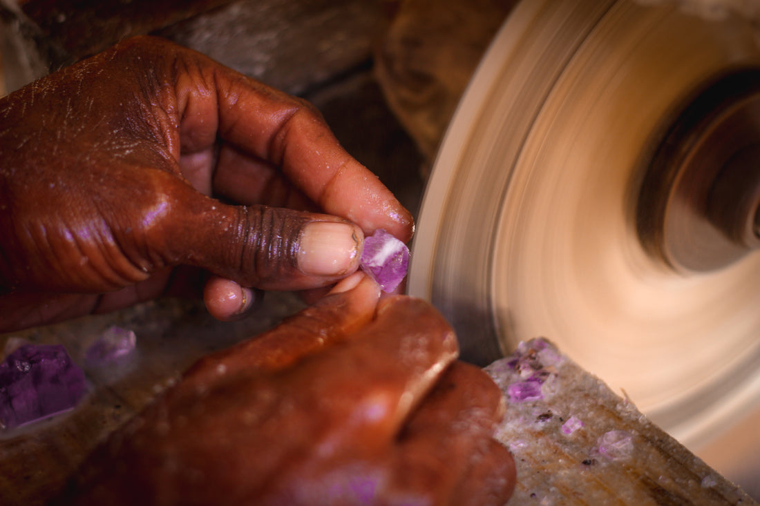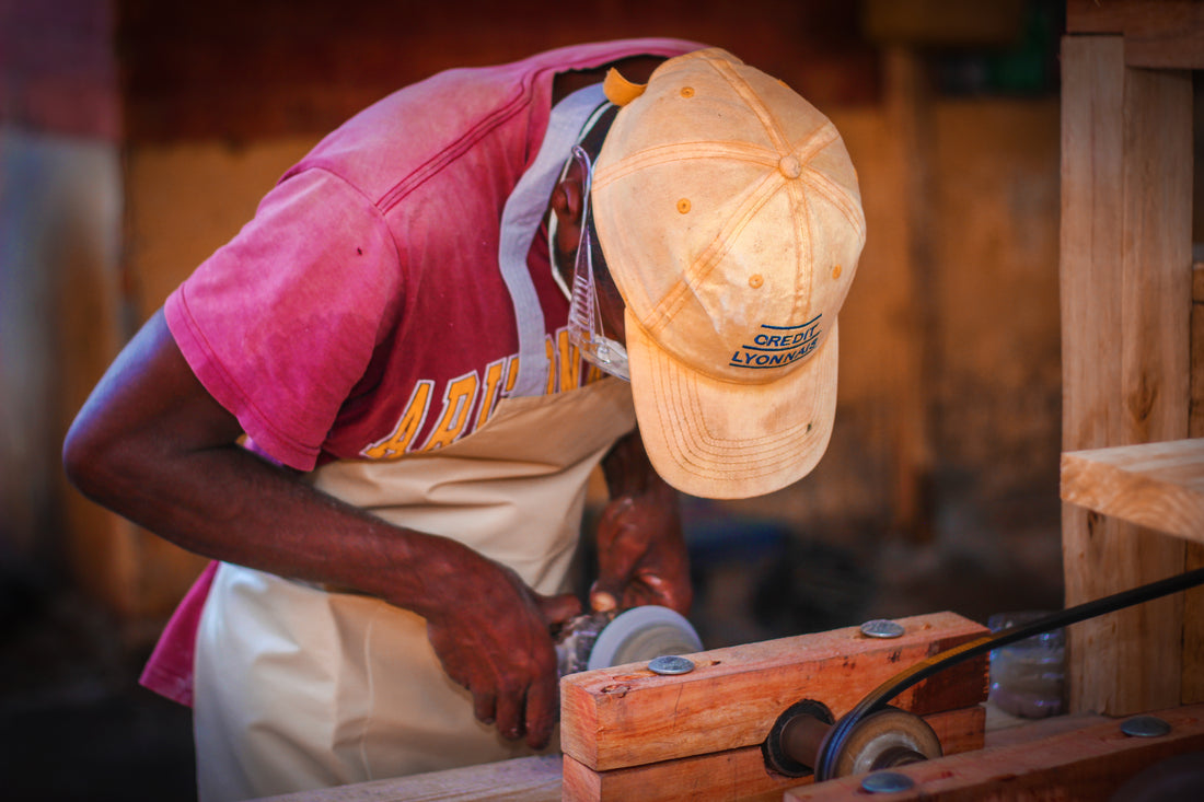 Chaque pierre est sélectionnée, puis façonnée à la main dans notre atelier à taille humaine, selon l’art traditionnel malgache.
